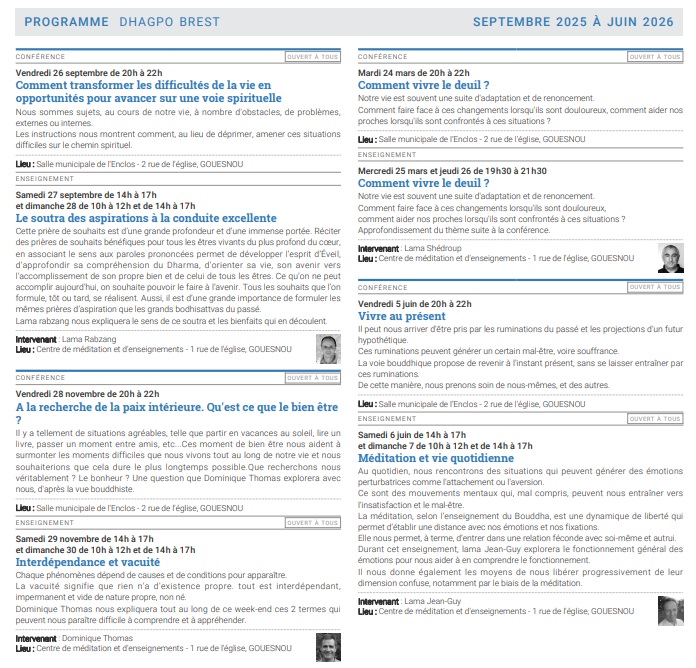 Chaque année, des lamas occidentaux et des érudits tibétains (khenpo ou acharya) sont invités par Dhagpo Brest pour animer des conférences et des enseignements ouverts à tous. Voir le programme..